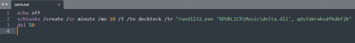 ”sdelta.bat”主要是创建计划任务”deckteck”,用来加载"%Public%\Music\delta.dll"的导出函数”qdsfakraksdfkdkfjk”,以实现delta.dll自启动,值得注意的是文件delta是”德尔塔”毒株的希腊名称,以delta名称命名,可用来迷惑用户。
