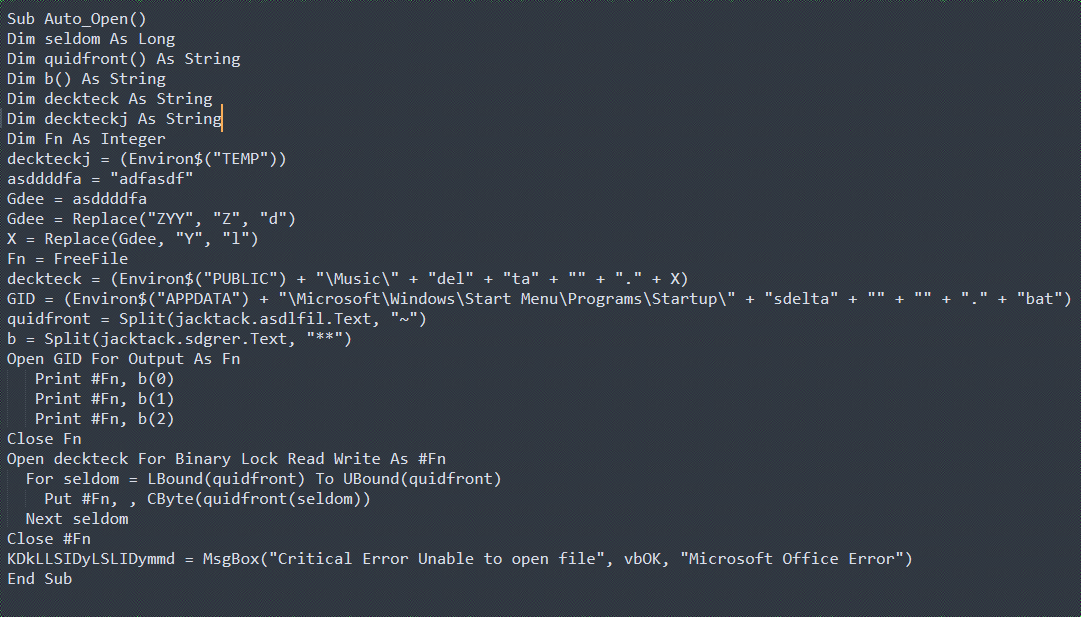 “EE 2021 B Final ppt BUP.ppt”文档中的宏执行后会释放"%Public%\Music\delta.dll"文件,并在系统启动目录下释放”sdelta.bat”文件。