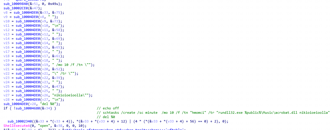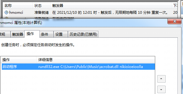 当%public%\Music\acrobat.dll文件存在时,则创建计划任务”hmomci”,实现acrobat.dll的自启动,启动方式是通过rundll32加载acrobat.dll名为”nikioioeioolla”的导出函数。