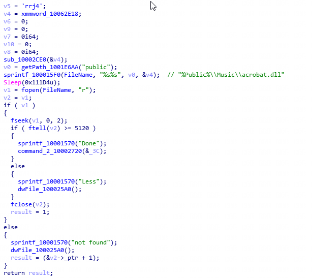 delta.dll包含一个名为”qdsfakraksdfkdkfjk”的导出函数,加载后会判断是否存在%public%\Music\acrobat.dll文件。
