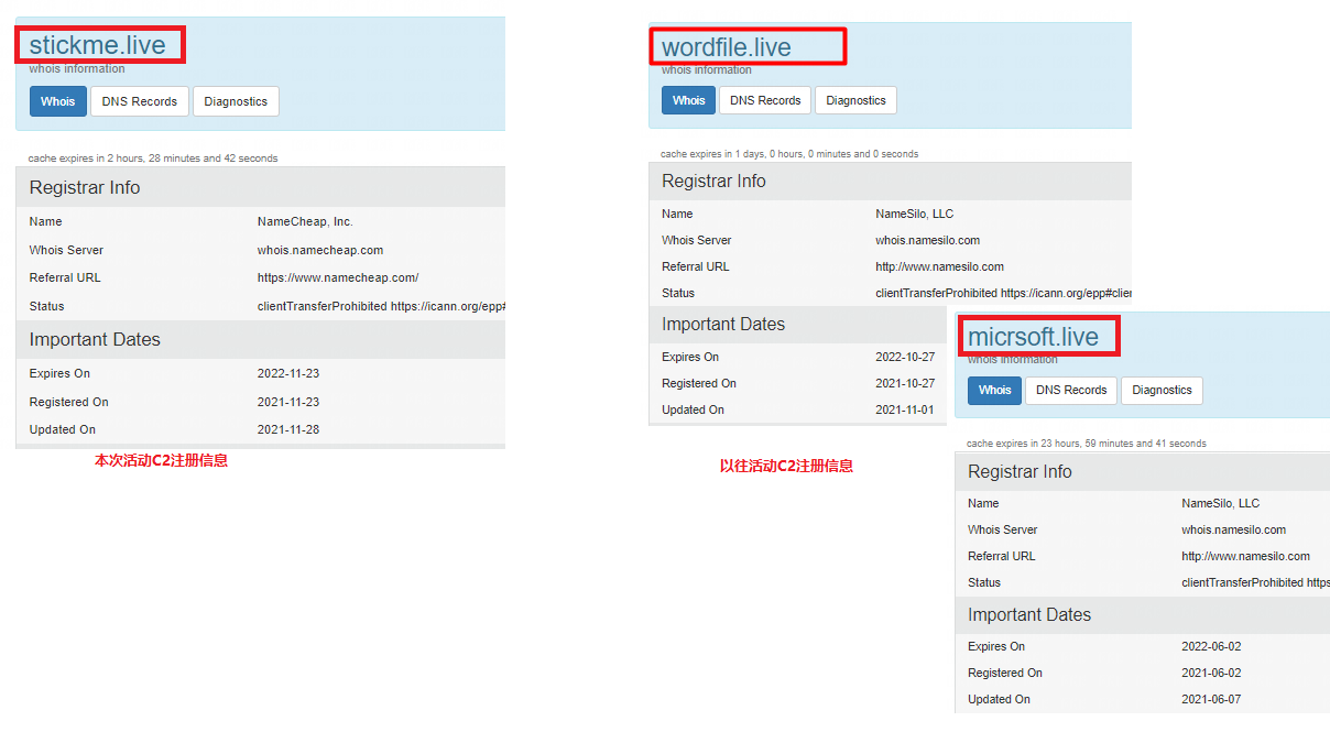 Donot 本次活动和以往活动中的C2注册信息都较有特点:注册时间都为1年、注册商主要是namecheap、NameSilo。