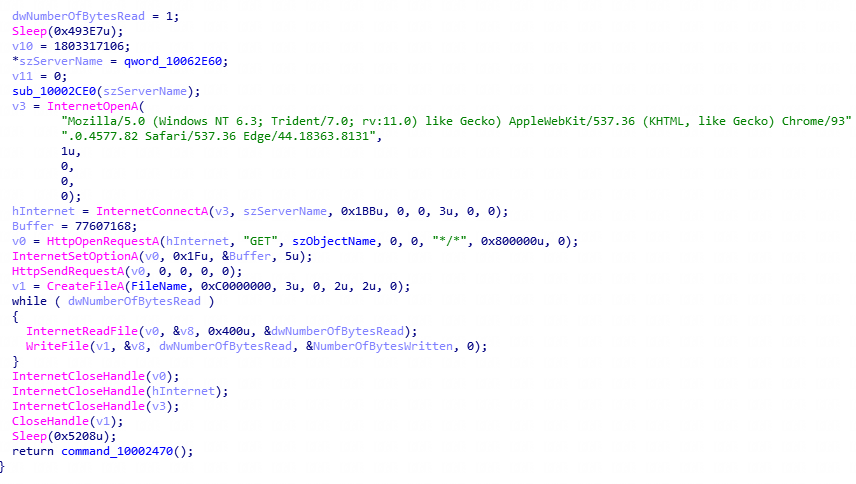 在实际分析过程中,远程服务器端口开放,收集的用户信息可以上传成功,但服务器未返回后续模块acrobat.dll,可能是服务器端只会对部分”有价值”的目标进行后续攻击载荷的下发。