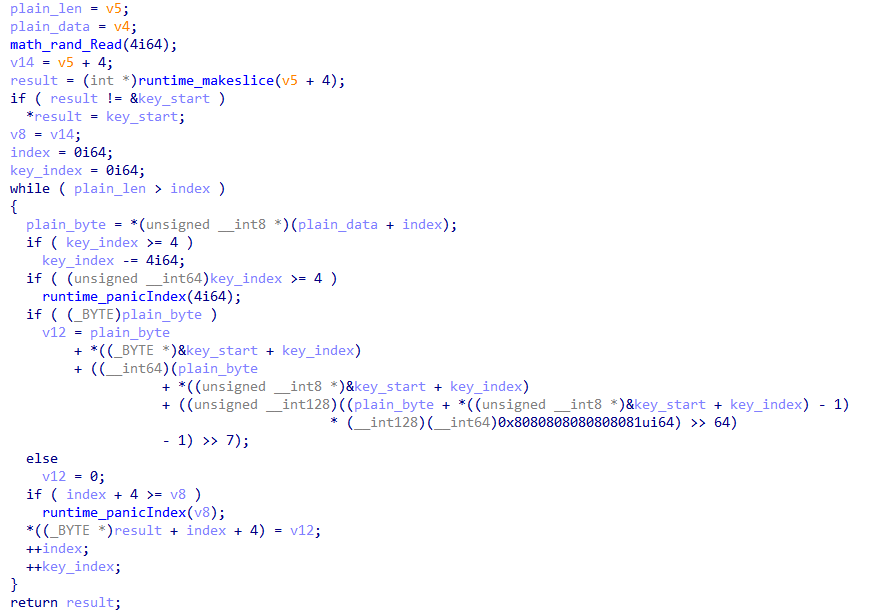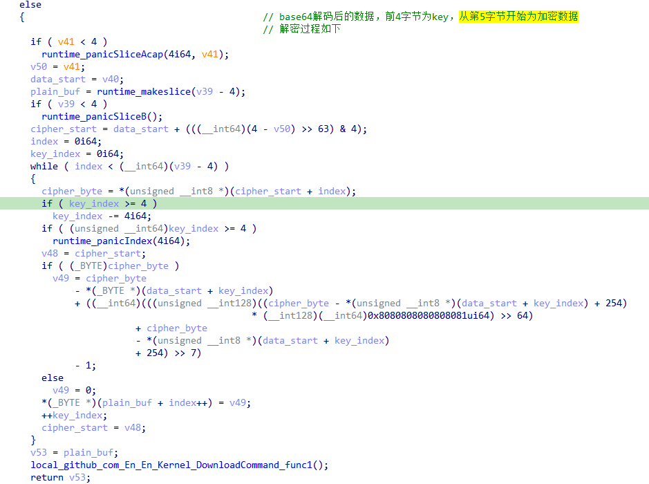 After receiving the response from the server, Endoor determines whether the first letter is "S" (for Success), if so, it tries to base64 decode the data other than the first letter. The decoded data consists of a 4-byte encrypted key and encrypted data, and then further decryption operations are performed.