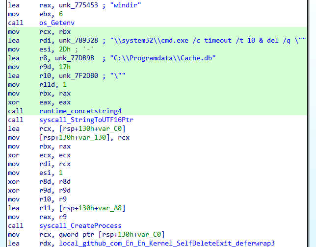 There are two things that make this Endoor backdoor different from the historical samples though, firstly, the time to record the next connection to the C&C server is no longer saved in the registry, but stored directly in the global variables of the sample. Secondly, the sample uses the hard-coded path "C:\\Programdata\\Cache.db" when deleting itself, instead of the actual location where the sample is saved, for example, the Endoor sample mentioned above copies itself as svchost.exe, which will cause the self-deletion operation to not take effect, and it is speculated that it may be a bug left behind by the attacker when tweaking the code.