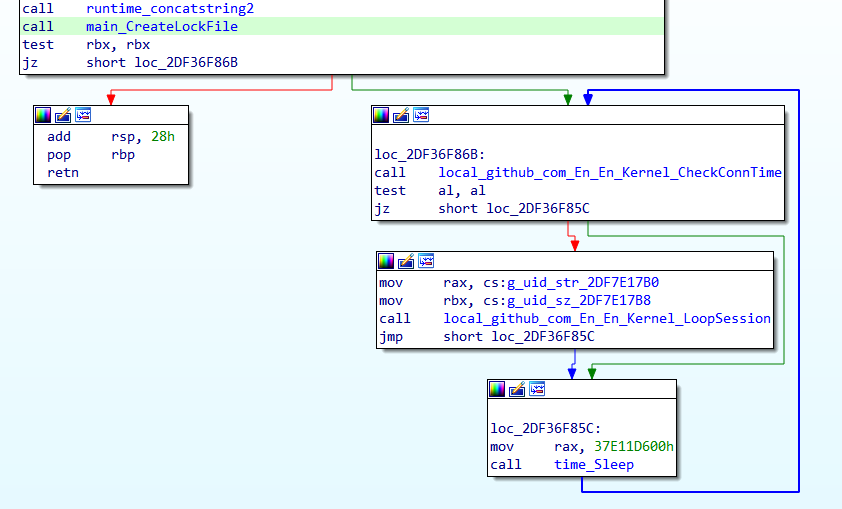 The working directory is switched and a lock file is created to ensure a single instance of the malicious program, named after the generated UID. After performing these initialization operations, Endoor enters the LoopSession loop.