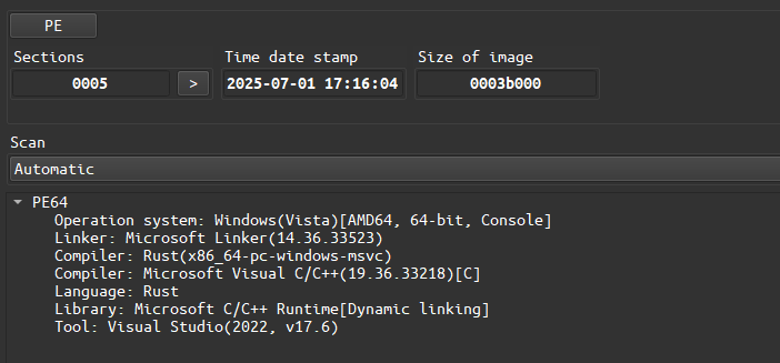 The loader Winver.exe, disguised in name as a program that comes with the system to get version information, is written in the Rust language and the developer uses the username testPD.