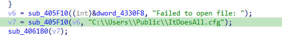The subsequent payloads of the above LNK samples are no longer available, and the Qi'anxin Threat Intelligence Center found that the malicious file Winver.exe (MD5: 13c5617da56d8b821e6acd1d5c8f8780) of the same name appeared in the Patchwork group's attacks against domestic users, which read and added to load C:\Users\Public\ The sample reads and loads the C:\Users\Public\file ItDoesAll.cfg, which is the same as the path where LNK files are saved to download subsequent components.