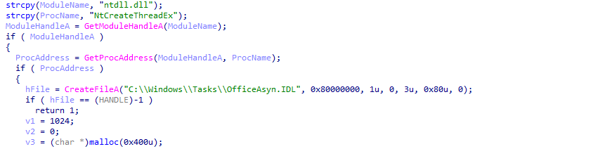 The loader (MD5: 85ba2585c44c95c9ab40fffa2cdd6e36) reads and loads the C:\Windows\Tasks\OfficeAsyn.IDL file.