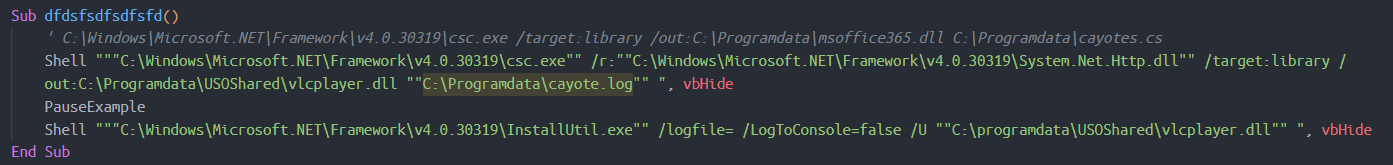 In the macro code carried by the xlam file, the base64 decodes a copy of the backdoor source code data written in C# and saved as "C:\\programdata\\cayote.log". NET framework's csc.exe to compile it into "C:\\Programdata\\USOShared\\vlcplayer.dll" and install it with InstallUtil.exe.