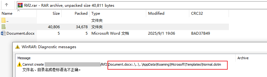 According to the path of Normal.dotm in the zip archive, the malicious RAR tries to overwrite the Normal.dotm file of the current user's original template library ("C:\\ Users\\<user name>\\ AppData\\ Roaming\\ Microsoft\\Templates\\Normal. dotm") after unzipping. dotm"). This requires the victim to decompress the file in a directory such as "C:\\Users\\<Username>\\XXX" in order to achieve the overwrite, whereas if the victim is used to decompressing the file in a directory such as the downloads directory ("C:\\Users\\<User>\\Downloads") or the desktop ("C:\\Users\\<User>\\Desktop") to decompress the received zip file directly, which will play right into the attacker's hands.