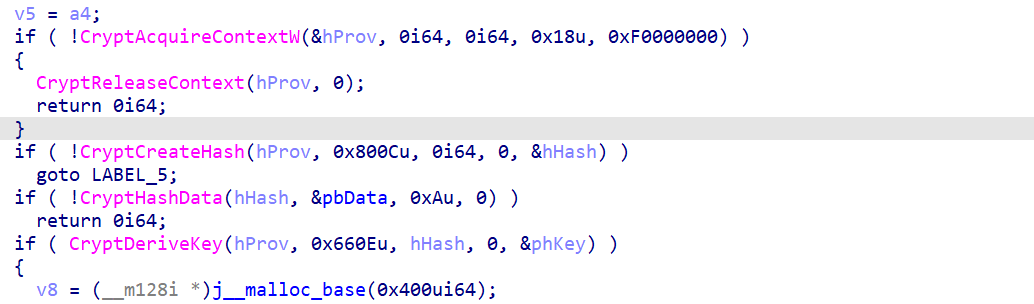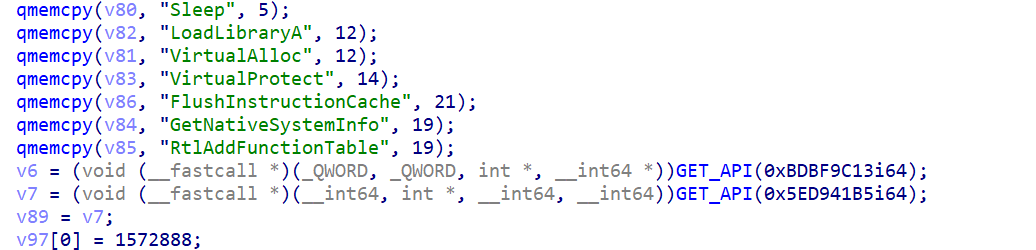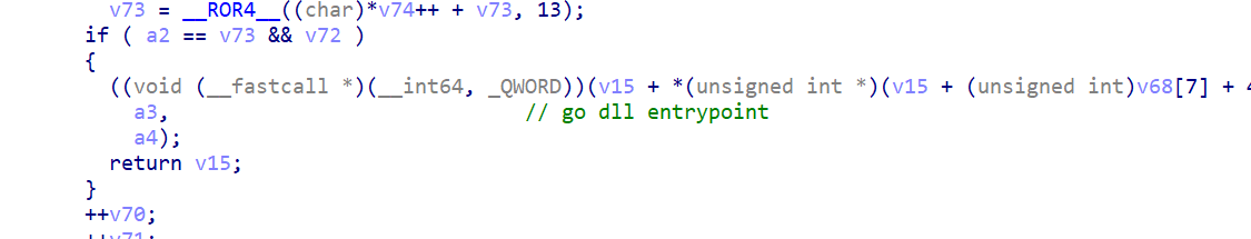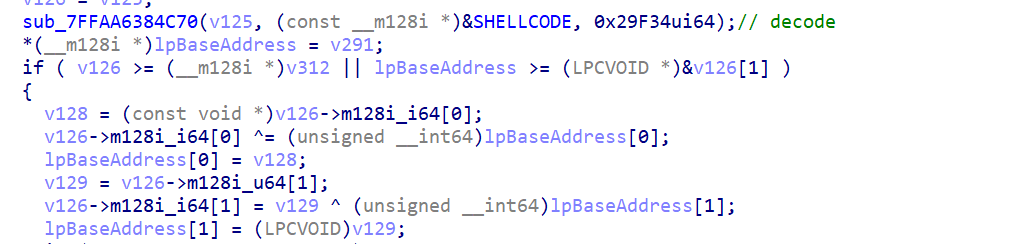 之后同样会在内存中解密出第二阶段 shellcode,该 shellcode 是个 dll,加载完毕后会跳转到 dll 的入口点执行,在该 dll 中执行恶意行为。