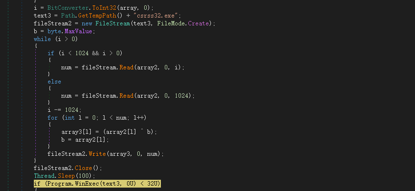 csrss32.exe 会在内存中解密一个 dll 文件,并将其释放到 C:\Users\Public\cgfadb.pos。