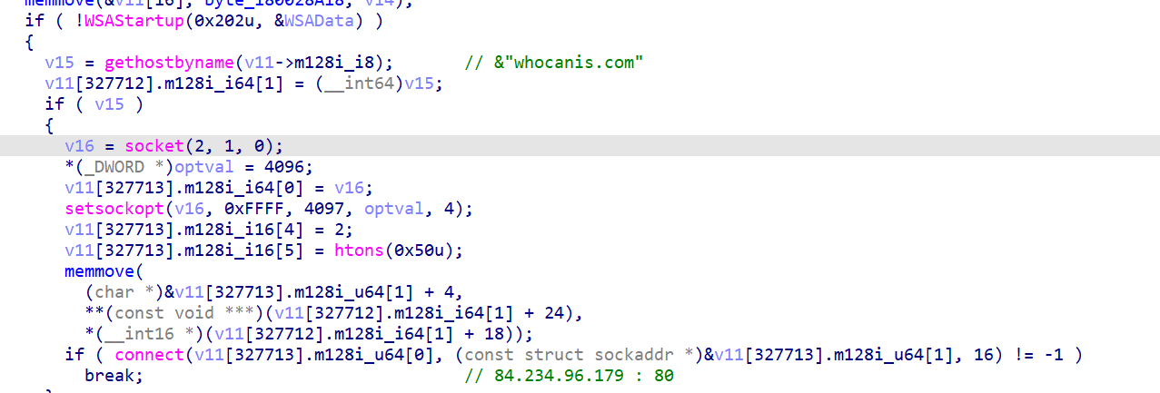 之后会在内存中解析出 C2:whocanis.com,通过 socket 连接 C2。