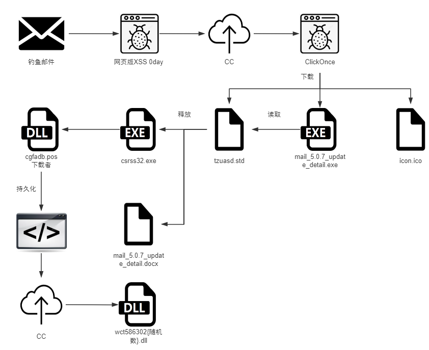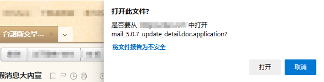 由于 CilckOnce 技术需要与受害者交互的次数较多,所以钓鱼成功率并不太高,为了解决“用户交互”问题,旺刺组织挖掘了某邮件平台网页版的 XSS 0day 漏洞(目前 XSS 已经被修复),通过 XSS 漏洞触发 CilckOnce 的 js,当受害者打开钓鱼邮件的瞬间,浏览器进程会自动弹出 CilckOnce 钓鱼框,模仿邮件更新行为:
