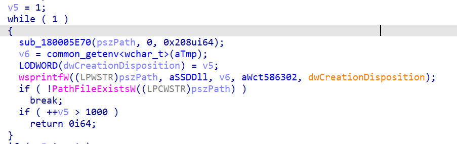 最后将接收到的内容写入 TMP 文件夹下的 wct586302 + 数字.dll 文件中,其中数字从 1 开始,最大可到 1000,直到遍历到 wct586302 + 数字.dll 文件不存在则写入。