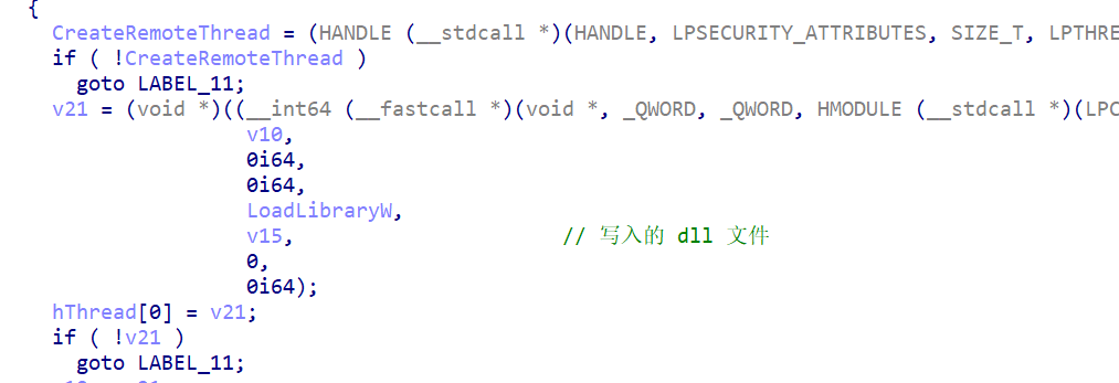 最后通过 CreateRemoteThread 向 explorer.exe 注入线程,其线程入口点为 LoadLibraryW函数,传递给线程的参数为之前写入的 dll 文件。