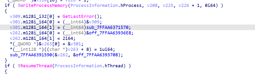 之后修改 svchost.exe 入口点代码,让其指向 shellcode,最后 ResumeThread 执行。