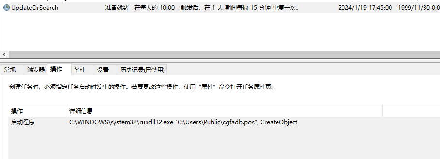 之后会创建计划任务,使用 rundll32 执行 cgfadb.pos 中的导出函数 CreateObject