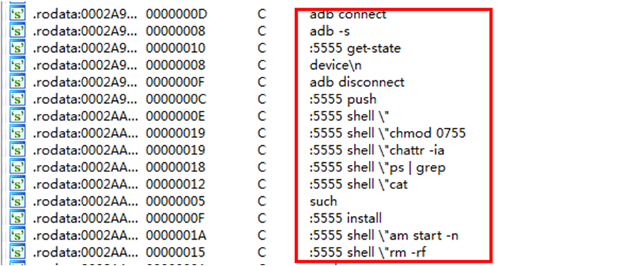 蠕虫式传染:被感染设备会对外发起 TCP 5555 adb 调试端口扫描,并尝试执行 adb 命令把自身拷贝到新的感染机器