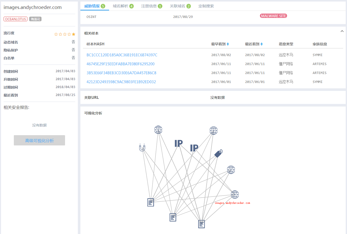 网络层的IOC方面主要涉及如下几个在2017年4月3日集中注册的域名(同天注册似乎是海莲花团伙的操作惯例,甚至可以作为识别团伙的特征之一)。