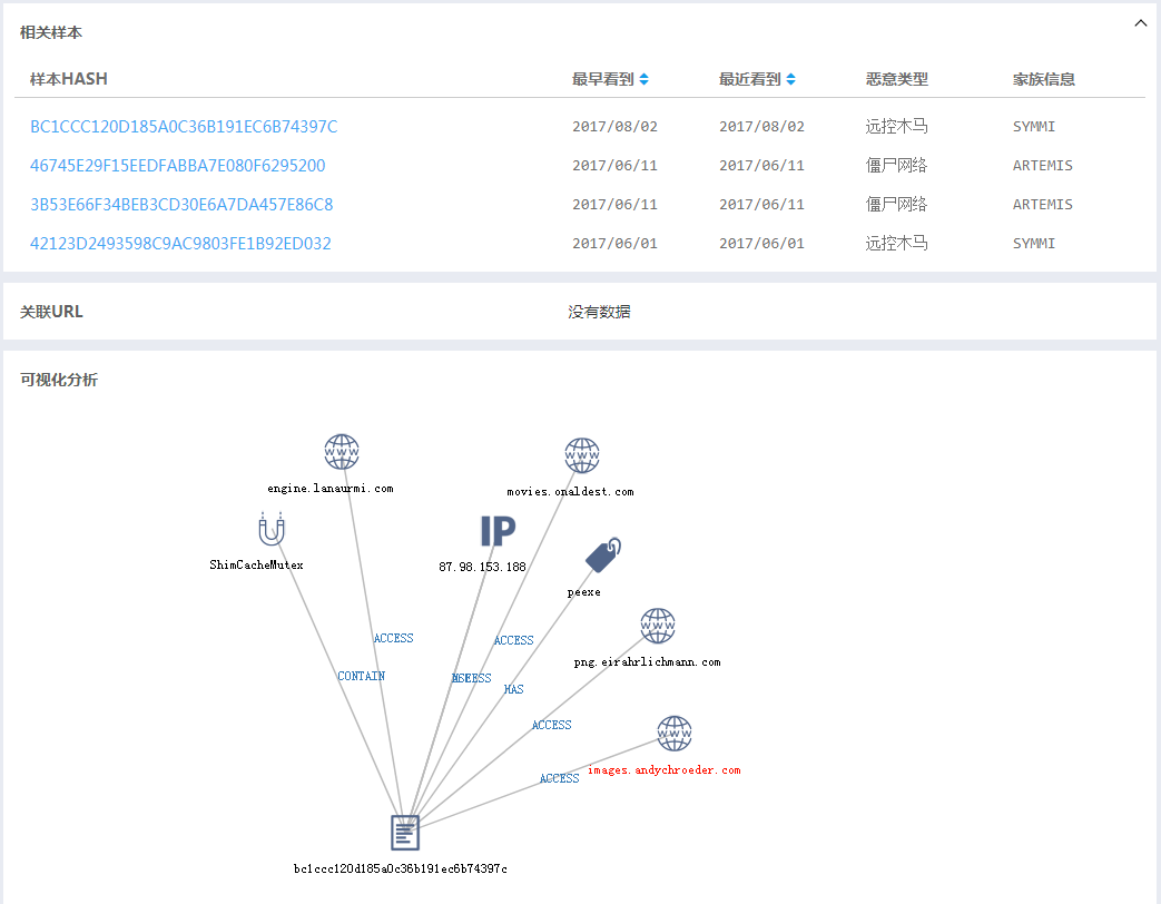 威胁情报中心发现的相关多个样本和IP/域名等基础设施: