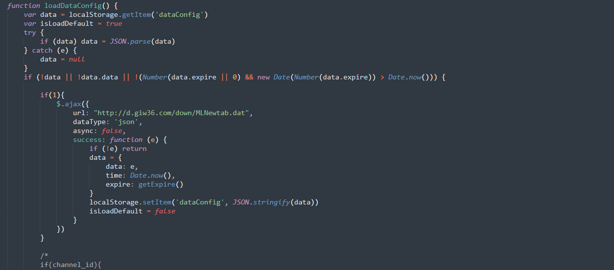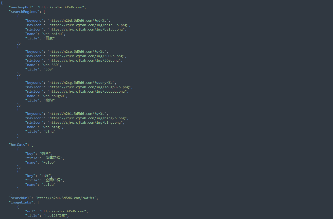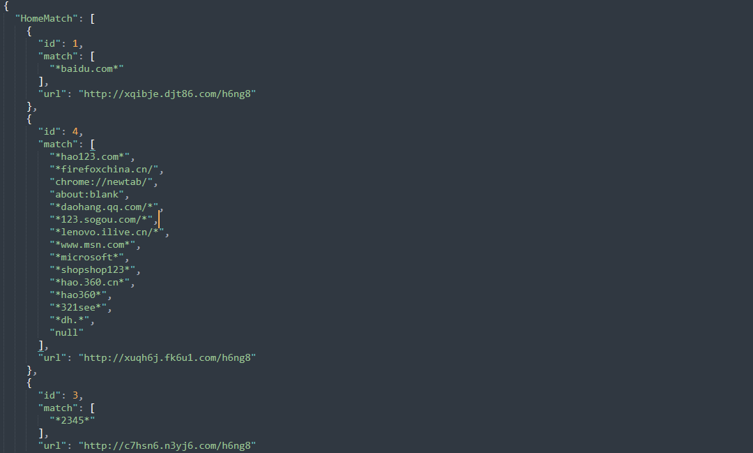 The fetched MLNewtab.dat configuration is as follows, hijacking most page content to attacker-controlled redirect links: