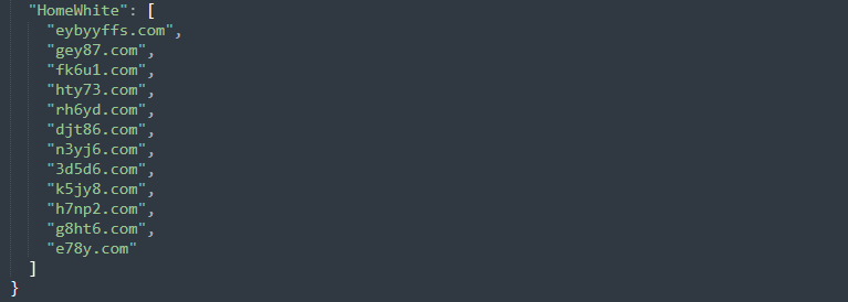 Based on the returned configuration file, the attacker adds their controlled domains to a whitelist. The following IOCs can be extracted from the whitelist content: