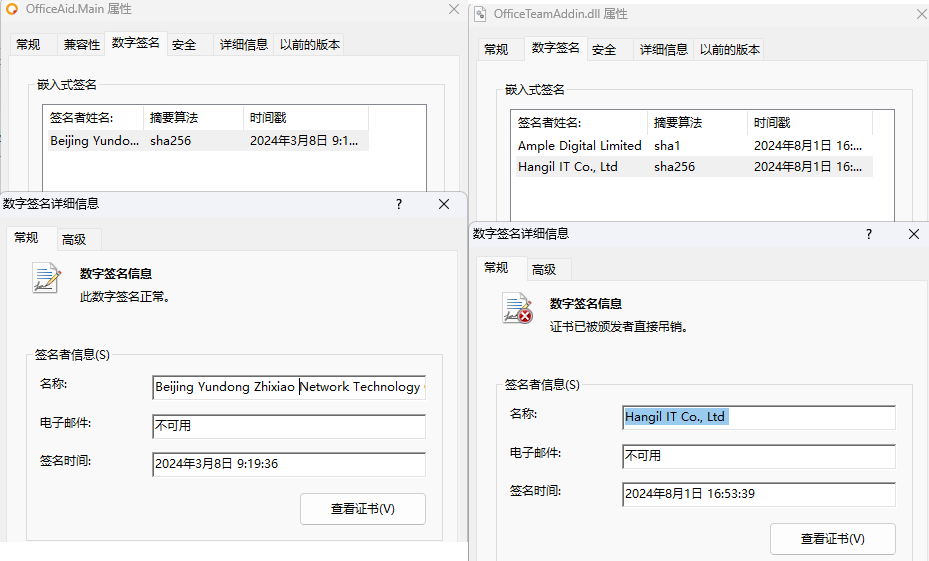 It then requests the C2 domain ofsd.fh67k.com and drops a malicious plugin named OfficeTeamAddin.dll in the %appdata%\Office\TeamAddin directory. Notably, the digital signature on this DLL differs from the official Office Assistant signature: