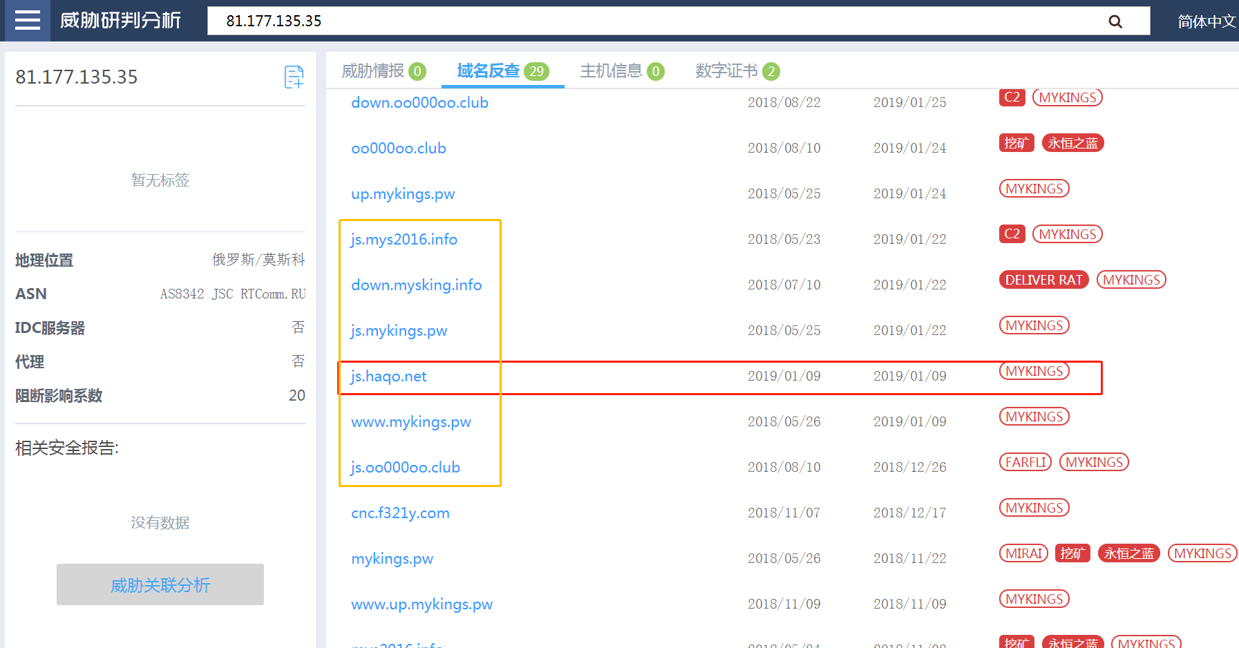 查看81.177.135.35的信息,发现该IP在2018年-2019年的时间段基本上是被Mykings家族所使用,下图可以看到此IP绑定的域名几乎全是Mykings使用的C&C,域名格式为js.xxx.xxx,与Mykings的一些子域名格式一致,并且一直到2019年1月24日Mykings的众多域名依然解析到此IP上。而在2019年1月09日,攻击驱动人生的幕后团伙所使用的域名js.haqo.net也解析到了这个IP。