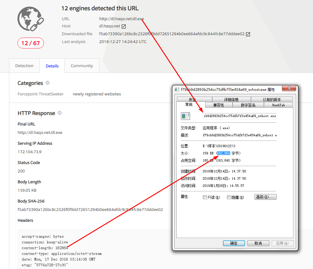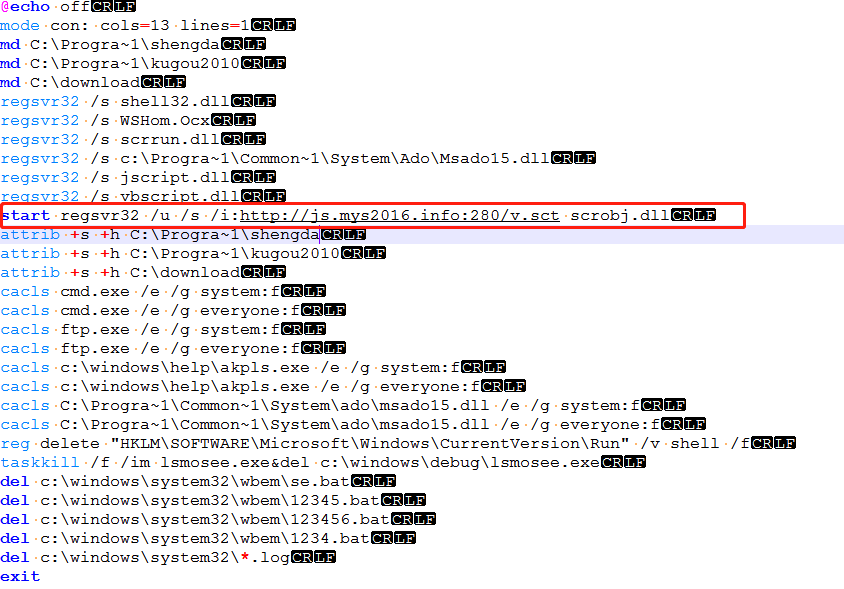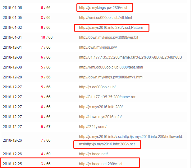 Mykings会配合云端机制发起扫描然后尝试扫描和入侵,因此被捕获的样本量相当多; 驱动人生事件的永恒之蓝挖矿蠕虫也会主动进行传播,被捕获的样本量也不少。但是, hxxp://js.haqo.net:280/v.sct这个链接指向文件无法下载,2018-12-25日VT上首次出现这个URL时,甚至连TCP连接都没能建立起来,网络上也并没有留存任何请求了这个URL的样本或者URL的相应数据。