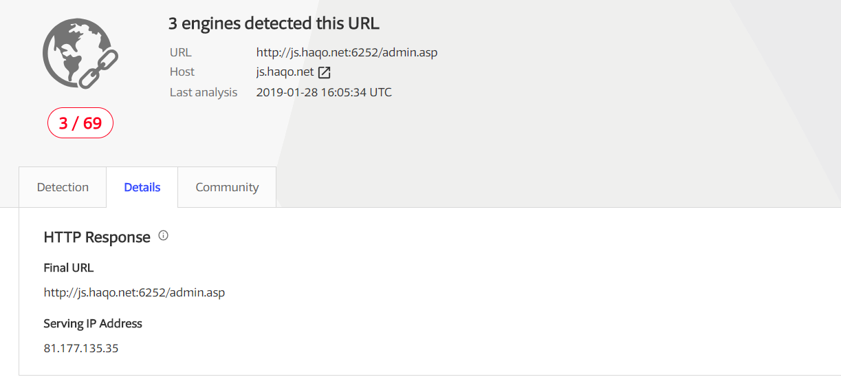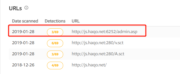 例如随意输入hxxp://js[.]haqo.net:6252/admin.asp,尽管请求没成功什么数据也没有返回,依然有三个引擎产生了告警。而再次搜索js.haqo.net时,关联URL中已然多了一条: hxxp://js[.]haqo.net:6252/admin.asp