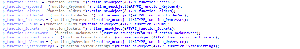 The remote control functions are as follows: screenshot, keystroke logging, reading folders, setting folders, starting processes, running cmd commands, setting socket connections, getting browser logs, getting network connection information, updating the Trojan horse, and getting system information.