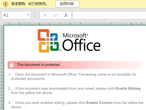 样本名为schedule_Oct-Dec(1).xls,意为”10月到12月的时间表”,样本打开后会提示受保护的文档,要求用户启用宏,如果用户点击启用宏,文档中的恶意宏代码就会被执行。
