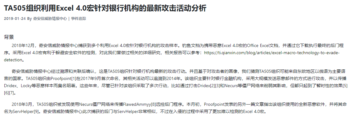 奇安信威胁情报中心将会对TA505攻击组织历史活动进行简单回顾,之后对本次活动进行详细分析。