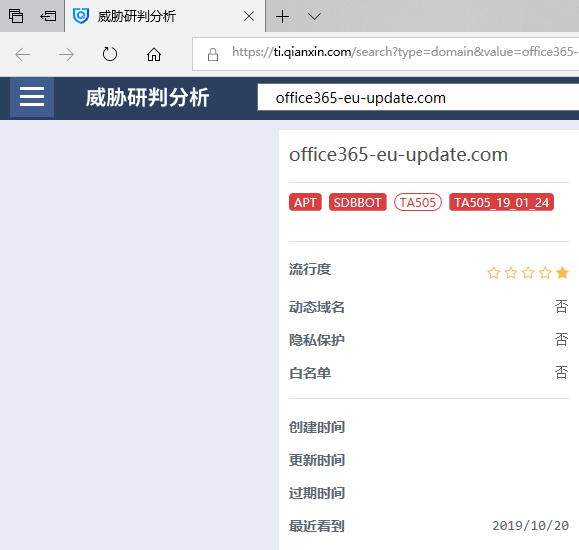 目前奇安信集团全线产品,包括天眼、SOC、态势感知、威胁情报平台,支持对涉及该报告相关的攻击活动检测,通过奇安信威胁情报平台对C2域名进行查询,可见已被标记为TA505组织。