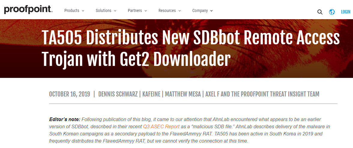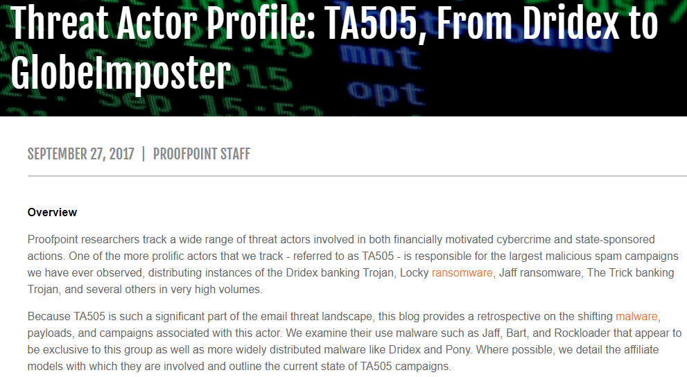 TA505为proofpoint披露的网络犯罪组织,其相关活动可以追溯到2014年。该组织攻击目标为全球金融机构,采用大规模发送恶意邮件的方式进行攻击,曾经大范围传播Dridex,Locky等恶意程序。近年来各国执法机构已针对该组织采取了多次打击行动,比如通过打击Dridex等僵尸网络来削弱其影响,但都没有起到明显效果,直至今日,TA505仍然在网络上非常活跃。