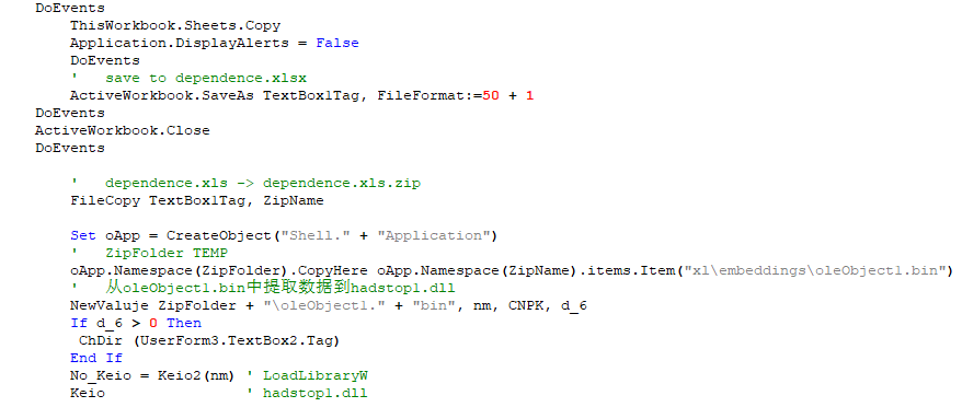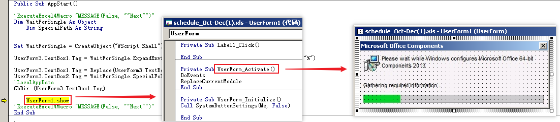 宏代码执行过程中会弹出一个进度条图片迷惑用户,并通过窗体的触发函数执行下一阶段恶意宏代码,其中ReplaceCurrentModule函数为主要功能函数。