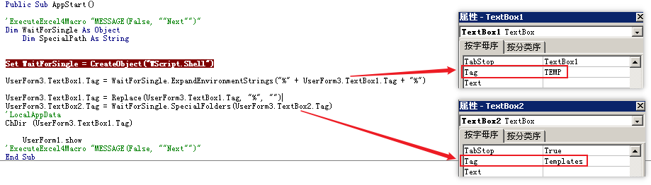 样本将路径信息存储在UserForm3窗体中两个TextBox控件的Tag属性中。