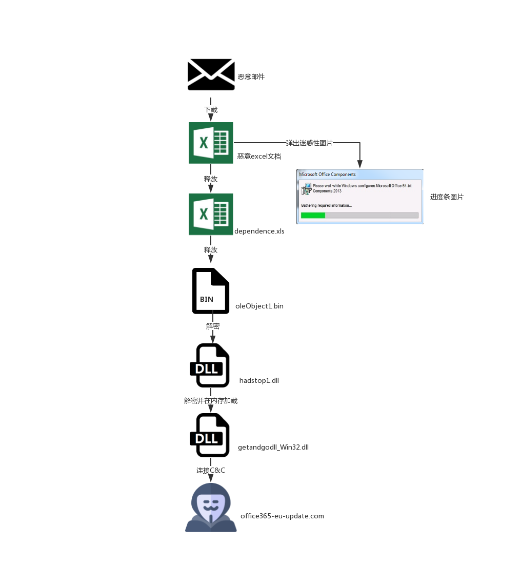 近日,奇安信威胁情报中心在日常样本监测中发现了TA505新的一轮攻击活动,本轮攻击中TA505仍然使用恶意邮件作为入口,诱使受害者通过邮件中的短链接下载恶意excel文档并启用宏,通过宏代码执行恶意功能,有趣的是恶意宏执行后会弹出一个进度条图片用于迷惑用户。